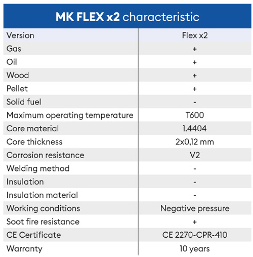 MK FLEX x2 is designed for stoves, atmospheric boilers for gas, oil, wood, pellet , as well as for condensing and Turbo boilers for gas and oil.