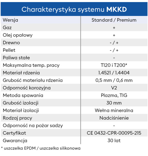 * Elementy systemu MKKD Standard w średnicach ⌀60, ⌀80, ⌀100 posiadają w komplecie uszczelkę EPDM (kotły kondensacyjne, max. temperatura pracy T120)