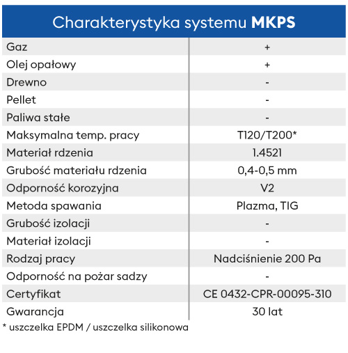 • Elementy systemu MKPSI w średnicach ⌀60-100, ⌀80-125, ⌀100-150, ⌀110-160 posiadają w komplecie uszczelkę EPDM (kotły kondensacyjne, max. temperatura pracy T120).